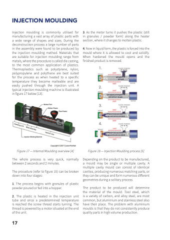 1 The process begins with granules of plastic powder poured or fed into a a hopper 2 The plastic is heated in in in the injection unit tube and once a a a a a a a a predetermined temperature is is reached the the screw thread thread starts turning The thread thread is is powered by a a a a a a a motor situated at at the the the end of the unit 17 3 As the the the motor turns it pushes the the the plastic (still in granules / powder form) along the the the heater section where it changes to molten plastic 4 Now in in liquid form the the plastic is is forced into the the mould mould where it is is allowed to to cool and and solidify When hardened the the mould mould opens and and the the finished product is is removed Figure 18 — Injection Moulding process [5]