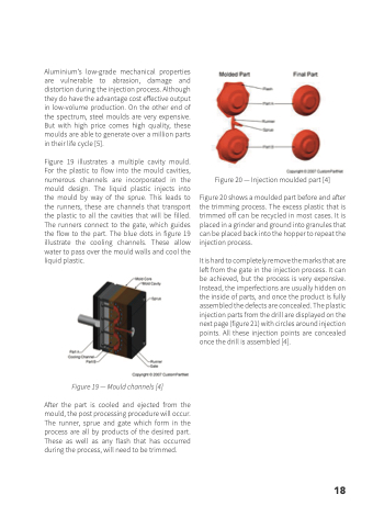 Figure 20 shows a a a a a a moulded part before and after the trimming process The excess plastic that is is trimmed off can be recycled in in in in in most cases It is is placed placed in in in in in a a a a a a a a a a a grinder and ground into into granules that can be placed placed back into into the the hopper to to to repeat the the injection process It It is hard to completely remove the the the marks that are left from the the the the gate in in the the the the injection process process It It can be achieved but the the the the process process is very expensive Instead the the the the imperfections are usually hidden on on on the the the the inside of parts and once once the the the the product is fully assembled the the the the the defects are are concealed The plastic injection injection parts from the the the drill are are displayed on on on on the the the next page (figure 21) with circles around injection injection injection points points All these injection injection points points are concealed once the the drill is assembled [4]