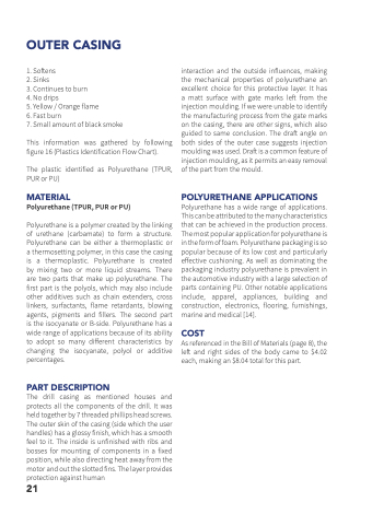 interaction and the the outside influences making the the mechanical properties of polyurethane an an an an excellent choice for this protective layer It has a a a a a a a a matt surface with gate marks left from the injection moulding If we we were unable to identify the the the the the manufacturing process from the the the the the gate marks on on on on the the the the the casing there are other signs which also guided to same conclusion The draft angle on on on on on both sides of of the outer case suggests injection moulding moulding was used Draft is a a a a a a a a a common feature of of injection moulding moulding as as as it it permits an easy removal of the the part from the the mould mould POLYURETHANE APPLICATIONS
