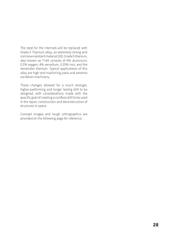 The steel for the internals will be replaced with Grade Grade 5 5 Titanium alloy an an an an an extremely strong and corrosive resistant material [20] Grade Grade 5 5 titanium also known as Ti-64 consists of 6% aluminum 0 0 2% oxygen 4% vanadium 0 0 25% iron and the remainder titanium Typical applications of this alloy are high end machining parts and extreme condition machinery These changes allowed for for a a a a a much stronger higher-performing and longer lasting drill to be designed with with considerations made with with the specific goal of of creating a a a a a a a cordless drill to be used in in in the repair construction construction and deconstruction of of structures in in space Concept images and rough orthographics are provided on on the following page for reference 28