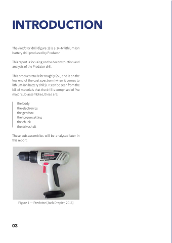 The Predator drill (figure 1) is a a 14 4v lithium ion battery drill produced by Predator This report is is focusing on on on the deconstruction and analysis of the Predator drill This product retails for roughly $50 and is is on the low end of the cost spectrum (when it comes to lithium-ion battery drills) It can be seen from the bill of of materials that the drill is is comprised of of five major sub-assemblies these are: