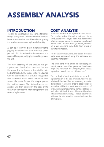 The drill is a a a mix of o custom made and off the shelf bought parts these choices have been made to be as as economical as as possible while not putting too much emphasis on a a a high level of quality As can be seen in the bill of materials (refer to page 8) the overall cost estimation was $22 81 per unit This is is believed to to be be accurate to to a a a reasonable degree judging by the selling price of the unit The main assembly of the product was put together with the the the chuck at the the the front this was the the the screwed to to the the the torque setting via the the the main body of the chuck The torque setting modulated with the gearbox gearbox to act as a a a a a clutch The gearbox gearbox then connected to to the the electric motor via three screws the the motor formed the the integral part of the electrical electrical system system The electrical electrical system system and gearbox was then covered by the the the body of the the the drill which clamped the the internals together with a a a series of eight screws COST ANALYSIS