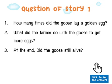 Question of Story 1 1. How many times did the goose lay a golden egg? 2. What did the farmer do with the goose to get more eggs? 3. At the end, Did the goose still alive? Click to See the Answers