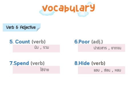 Vocabulary Verb & Adjective นับ , รวม น่าสงสาร , ยากจน ใช้จ่าย แอบ , ซ่อน , หลบ