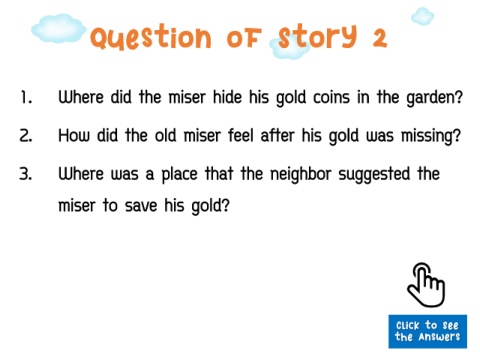 Question of Story 2 1. Where did the miser hide his gold coins in the garden? 2. How did the old miser feel after his gold was missing? 3. Where was a place that the neighbor suggested the miser to save his gold? Click to See the Answers
