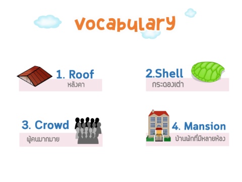 Vocabulary หลังคา กระดองเต่า ผู้คนมากมาย บ้านพักที่มีหลายห้อง