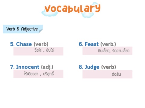 Vocabulary Verb & Adjective วิ่งไล่ , ขับไล่ กินเลี้ยง, จัดงานเลี้ยง ไร้เดียงสา , บริสุทธิ์ ตัดสิน