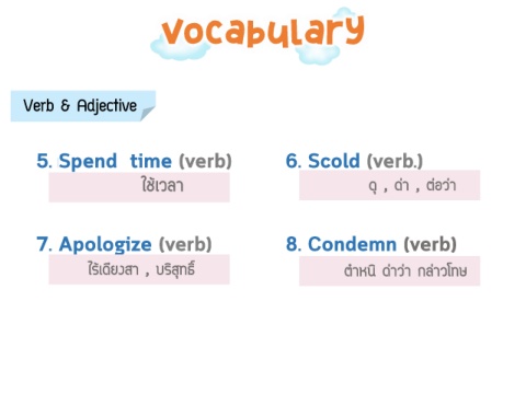 Vocabulary Verb & Adjective ใช้เวลา ดุ , ด่า , ต่อว่า ไร้เดียงสา , บริสุทธิ์ ต าหนิ ด่าว่า กล่าวโทษ