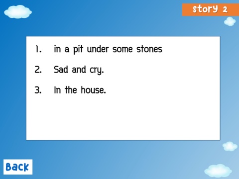 Story 2 1. in a pit under some stones 2. Sad and cry. 3. In the house. Back