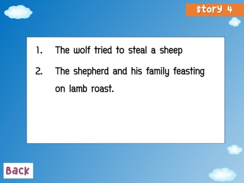 Story 4 1. The wolf tried to steal a sheep 2. The shepherd and his family feasting on lamb roast. Back