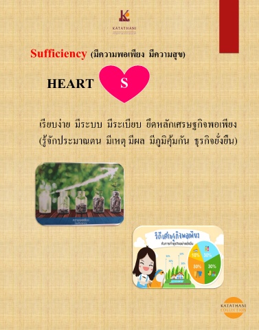 Sufficiency (มีความพอเพียง มีความสุข) HEART S เรียบง่าย มีระบบ มีระเบียบ ยึดหลักเศรษฐกิจพอเพียง (รู้จักประมาณตน มีเหตุ มีผล มีภูมิคุ้มกัน ธุรกิจยั่งยืน)