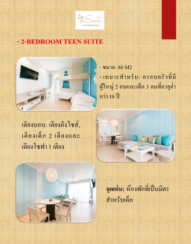 - 2-BEDROOM TEEN SUITE - ขนาด: 80 M2 - เหมาะส าหรับ: ครอบครัวที่มี ผู้ใหญ่ 2 คนและเด็ก 3 คนที่อายุต ่า กว่า 18 ป ี เตียงนอน: เตียงคิงไซส์, เตียงเด็ก 2 เตียงและ เตียงโซฟา 1 เตียง จุดเด่น: ห้องพักที่เป็นมิตร ส าหรับเด็ก