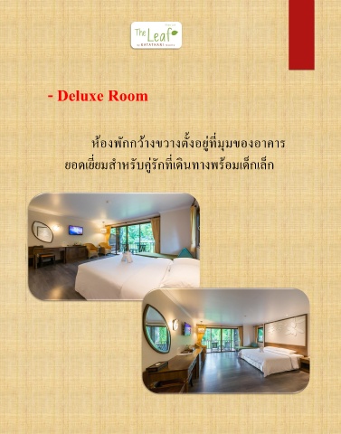 - Deluxe Room ห้องพักกว้างขวางตั้งอยู่ที่มุมของอาคาร ยอดเยี่ยมส าหรับคู่รักที่เดินทางพร้อมเด็กเล็ก