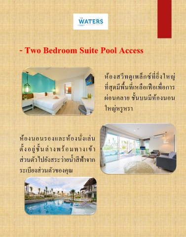 - Two Bedroom Suite Pool Access ห้องสวีทดูเพล็กซ์ที่ยิ่งใหญ่ ที่สุดมีพื้นที่เหลือเฟือเพื่อการ ผ่อนคลาย ชั้นบนมีห้องนอ น ใหญ่หรูหรา ห้องนอนรองและห้องนั่งเล่น ตั้ งอยู่ชั้ นล่างพร้อมทางเข้า ส่วนตัวไปยังสระว่ายน าสีฟ้าจาก ้ ระเบียงส่วนตัวของคุณ