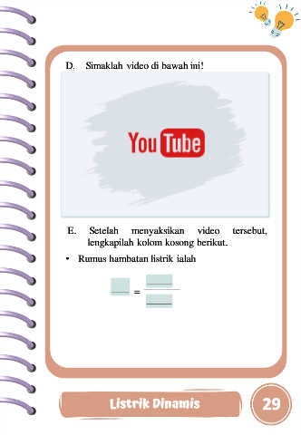 D. Simaklah video di bawah ini! E. Setelah menyaksikan video tersebut, lengkapilah kolom kosong berikut. • Rumus hambatan listrik ialah = 29
