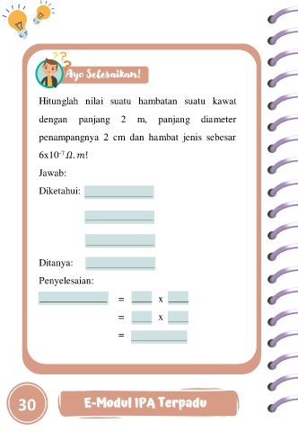 Ayo Selesaikan! Hitunglah nilai suatu hambatan suatu kawat dengan panjang 2 m, panjang diameter penampangnya 2 cm dan hambat jenis sebesar -7 6x10 . ! Jawab: Diketahui: Ditanya: Penyelesaian: = x = x = 30