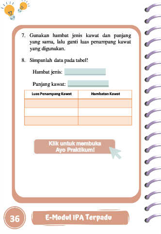 7. Gunakan hambat jenis kawat dan panjang yang sama, lalu ganti luas penampang kawat yang digunakan. 8. Simpanlah data pada tabel! Hambat jenis: Panjang kawat: Luas Penampang Kawat Hambatan Kawat Klik untuk membuka Ayo Praktikum! 36