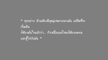 “ ทุกอย่าง ล้วนต้องมีจุดมุ่งหมายของมัน แค่คิดที่จะ เริ่มเดิน ก็ต้องมั่นใจแล้วว่า... ถ้าเหนื่อยแค่ไหนก็ต้องอดทน และสู้ไปกับมัน “