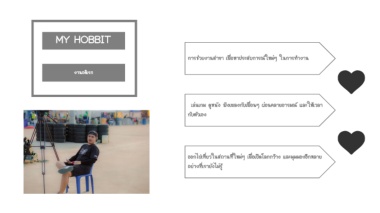 MY HOBBIT การช่วยงานสาขา เพื่อหาประสบการณ์ใหม่ๆ ในการท างาน งานอดิเรก gเล่นเกม ดูหนัง ฟังเพลงกับเพื่อนๆ ผ่อนคลายอารมณ์ และให้เวลา กับตัวเอง ออกไปเที่ยวในสถานที่ใหม่ๆ เพื่อเปิดโลกกว้าง และมุมมองอีกหลาย อย่างที่เรายังไม่รู้