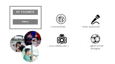 MY FAVORITE สิ่งที่ฉันชอบ - การหาอาหารอร่อยๆกิน - ร้องเพลง ผ่อนคลายอารมณ์ - ถ่ายภาพ บันทึกเรื่องราวต่าง ๆ - ดูฟุตบอล และข่าวสาร เกี่ยวกับฟุตบอล