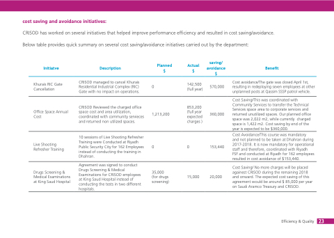 CRISOD has worked on several initiatives that helped improve performance efficiency and resulted in cost saving/avoidance. Below table provides quick summary on several cost saving/avoidance initiatives carried out by the department: