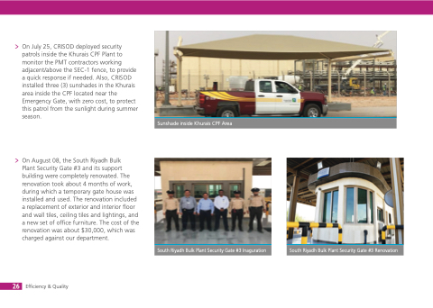 On July 25, CRISOD deployed security patrols inside the Khurais CPF Plant to monitor the PMT contractors working adjacent/above the SEC-1 fence, to provide a quick response if needed. Also, CRISOD installed three (3) sunshades in the Khurais area inside the CPF located near the Emergency Gate, with zero cost, to protect this patrol from the sunlight during summer season.