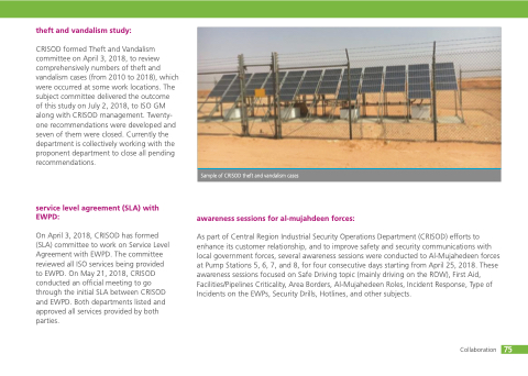 As part of Central Region Industrial Security Operations Department (CRISOD) efforts to enhance its customer relationship, and to improve safety and security communications with local government forces, several awareness sessions were conducted to Al-Mujahedeen forces at Pump Stations 5, 6, 7, and 8, for four consecutive days starting from April 25, 2018. These awareness sessions focused on Safe Driving topic (mainly driving on the ROW), First Aid, Facilities/Pipelines Criticality, Area Borders, Al-Mujahedeen Roles, Incident Response, Type of Incidents on the EWPs, Security Drills, Hotlines, and other subjects.