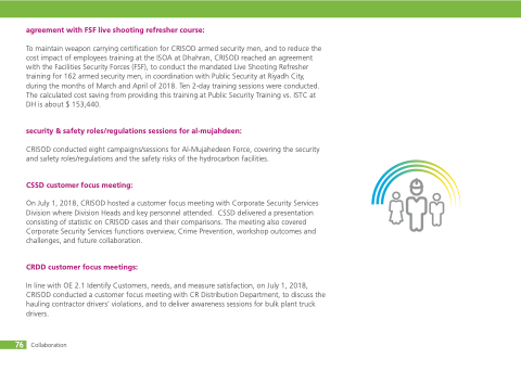 To maintain weapon carrying certification for CRISOD armed security men, and to reduce the cost impact of employees training at the ISOA at Dhahran, CRISOD reached an agreement with the Facilities Security Forces (FSF), to conduct the mandated Live Shooting Refresher training for 162 armed security men, in coordination with Public Security at Riyadh City, during the months of March and April of 2018. Ten 2-day training sessions were conducted. The calculated cost saving from providing this training at Public Security Training vs. ISTC at DH is about $ 153,440.