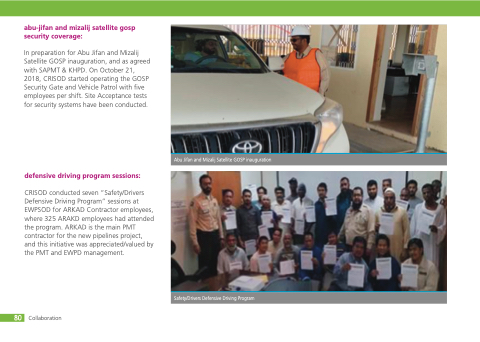 CRISOD conducted seven “Safety/Drivers Defensive Driving Program” sessions at EWPSOD for ARKAD Contractor employees, where 325 ARAKD employees had attended the program. ARKAD is the main PMT contractor for the new pipelines project, and this initiative was appreciated/valued by the PMT and EWPD management.