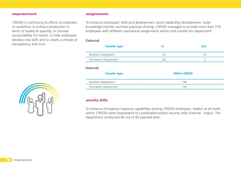 To enhance employees’ skills and development, boost leadership development, foster knowledge transfer and best practices sharing, CRISOD managed to provide more than 370 employees with different operational assignments within and outside the department: