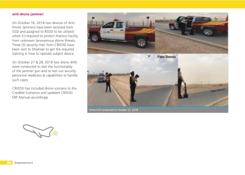 On October 16, 2018 two devices of Anti- Drone Jammers have been received from ISSD and assigned to RSOD to be utilized when it’s required to protect Aramco facility from unknown /anonymous drone threats. Three (3) security men from CRISOD have been sent to Dhahran to get the required training in how to operate subject device.