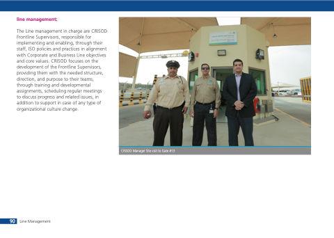 The Line management in charge are CRISOD Frontline Supervisors, responsible for implementing and enabling, through their staff, ISO policies and practices in alignment with Corporate and Business Line objectives and core values. CRISOD focuses on the development of the Frontline Supervisors, providing them with the needed structure, direction, and purpose to their teams, through training and developmental assignments, scheduling regular meetings to discuss progress and related issues, in addition to support in case of any type of organizational culture change.