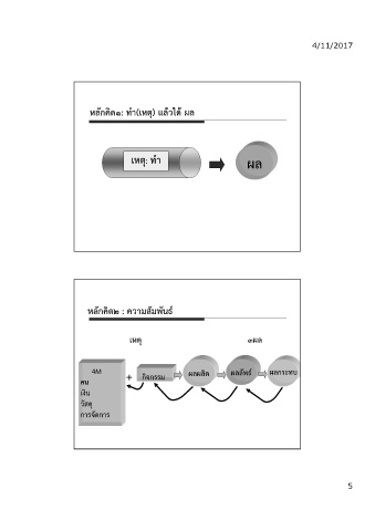 4/11/2017 หลักคิด1: ทํา(เหตุ) แล้วได้ ผล เหตุ: ทํา ผล หลักคิด2 : ความสัมพันธ์ เหตุ 3ผล 4M ผลผลิต ผลลัพธ์ ผลกระทบ + คน กิจกรรม เงิน วัสดุ การจัดการ 5