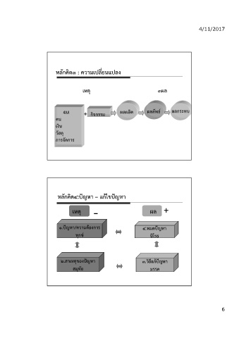 4/11/2017 หลักคิด3 : ความเปลี่ยนแปลง เหตุ 3ผล 4M ผลผลิต ผลลัพธ์ ผลกระทบ + กิจกรรม คน เงิน วัสดุ การจัดการ หลักคิด4:ปัญหา – แก้ไขปัญหา - + เหตุ ผล 1.ปัญหา/ความต้องการ 4.หมดปัญหา ทุกข์ นิโรธ 2.สาเหตุของปัญหา 3.วิธีแก้ปัญหา สมุทัย มรรค 6