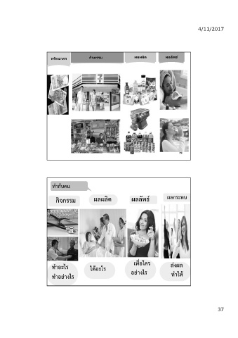 4/11/2017 ทรัพยากร กิจกรรม ผลผลิต ผลลัพธ์ 73 73 ทํากับคน กิจกรรม ผลผลิต ผลลัพธ์ ผลกระทบ เพื่อใคร ทําอะไร ได้อะไร ส่งผล ทําอย่างไร อย่างไร ทําให้ 74 37