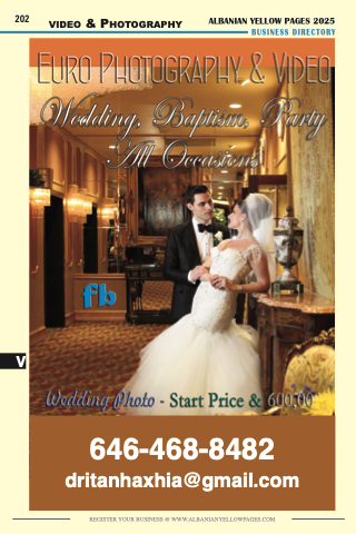 646-468-8482 dritanhaxhia@gmail.com V 202 VIDEO & PHOTOGRAPHY ALBANIAN YELLOW PAGES 2025 BUSINESS DIRECTORY REGISTER YOUR BUSINESS @ WWW.ALBANIANYELLOWPAGES.COM