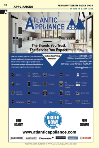 A Free Free Delivery! Delivery! www.atlanticappliance.com 70 APPLIANCES ALBANIAN YELLOW PAGES 2025 BUSINESS DIRECTORY REGISTER YOUR BUSINESS @ WWW.ALBANIANYELLOWPAGES.COM