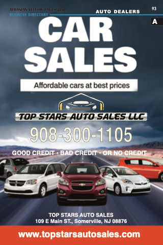 ALBANIAN YELLOW PAGES 2025 BUSINESS DIRECTORY AUTO DEALERS 93 GOOD CREDIT • BAD CREDIT • OR NO CREDIT TOP STARS AUTO SALES 109 E Main ST., Somerville, NJ 08876 www.topstarsautosales.com A