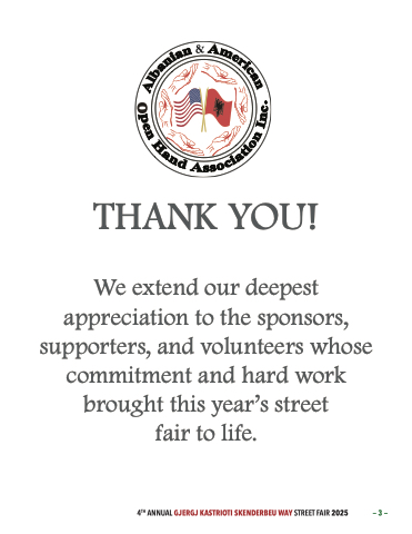 & O THANK YOU! We extend our deepest appreciation to the sponsors, supporters, and volunteers whose commitment and hard work brought this year’s street fair to life. 4TH ANNUAL GJERGJ KASTRIOTI SKENDERBEU WAY STREET FAIR 2025 — 3 —