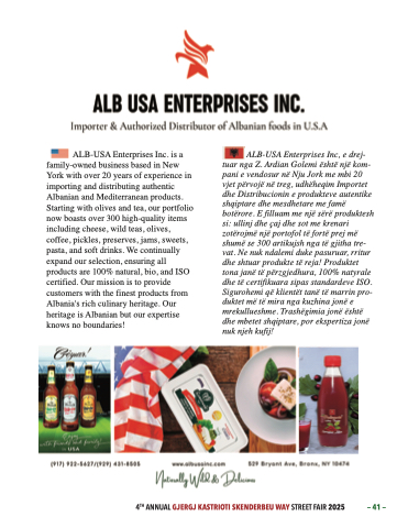 ALB-USA Enterprises Inc, e drej- tuar nga Z. Ardian Golemi është një kom- pani e vendosur në Nju Jork me mbi 20 vjet përvojë në treg, udhëheqim Importet dhe Distribucionin e produkteve autentike shqiptare dhe mesdhetare me famë botërore. E filluam me një sërë produktesh si: ullinj dhe çaj dhe sot me krenari zotërojmë një portofol të fortë prej më shumë se 300 artikujsh nga të gjitha tre- vat. Ne nuk ndalemi duke pasuruar, rritur dhe shtuar produkte të reja! Produktet tona janë të përzgjedhura, 100% natyrale dhe të certifikuara sipas standardeve ISO. Sigurohemi që klientët tanë të marrin pro- duktet më të mira nga kuzhina jonë e mrekullueshme. Trashëgimia jonë është dhe mbetet shqiptare, por ekspertiza jonë nuk njeh kufij!