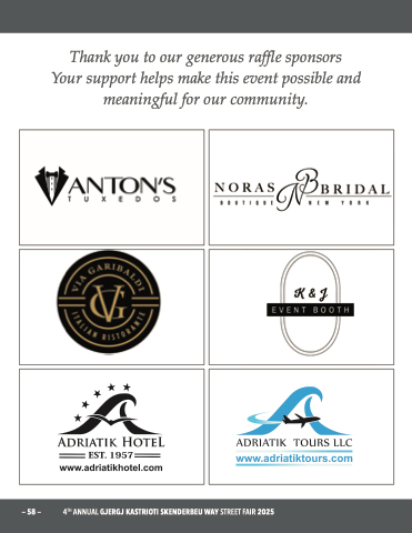 Thank you to our generous raffle sponsors Your support helps make this event possible and meaningful for our community. — 58 — 4TH ANNUAL GJERGJ KASTRIOTI SKENDERBEU WAY STREET FAIR 2025