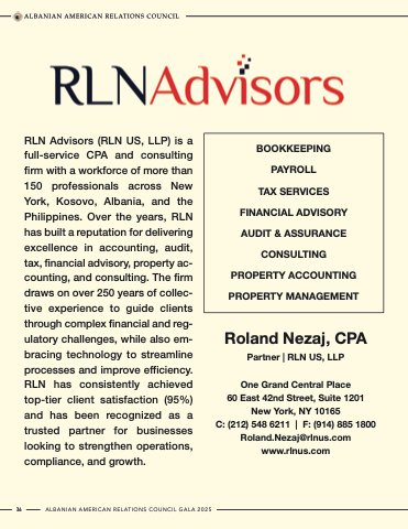 RLN Advisors (RLN US, LLP) is a full-service CPA and consulting firm with a workforce of more than 150 professionals across New York, Kosovo, Albania, and the Philippines. Over the years, RLN has built a reputation for delivering excellence in accounting, audit, tax, financial advisory, property ac- counting, and consulting. The firm draws on over 250 years of collec- tive experience to guide clients through complex financial and reg- ulatory challenges, while also em- bracing technology to streamline processes and improve efficiency. RLN has consistently achieved top-tier client satisfaction (95%) and has been recognized as a trusted partner for businesses looking to strengthen operations, compliance, and growth.