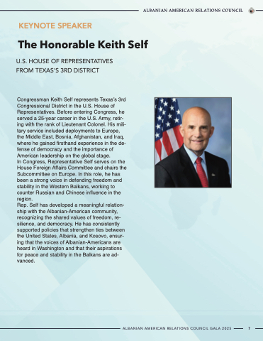Rep. Self has developed a meaningful relation- ship with the Albanian-American community, recognizing the shared values of freedom, re- silience, and democracy. He has consistently supported policies that strengthen ties between the United States, Albania, and Kosovo, ensur- ing that the voices of Albanian-Americans are heard in Washington and that their aspirations for peace and stability in the Balkans are ad- vanced.