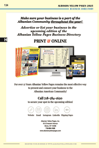 H 134 ALBANIAN YELLOW PAGES 2025 BUSINESS DIRECTORY REGISTER YOUR BUSINESS @ WWW.ALBANIANYELLOWPAGES.COM