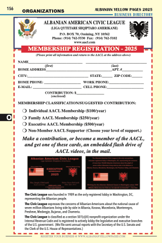 The Civic League expresses the concerns of Albanian Americans about the national cause of seven million Albanians living side by side in Albania, Kosova, Macedonia, Montenegro, Presheve, Medvegje, Bujanoc, and Chameria.