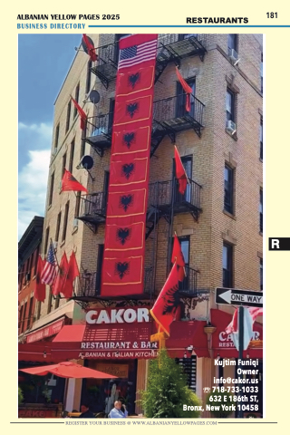 ALBANIAN YELLOW PAGES 2025 BUSINESS DIRECTORY RESTAURANTS 181 Kujtim Funiqi Owner info@cakor.us ☏ 718-733-1033 632 E 186th ST, Bronx, New York 10458 REGISTER YOUR BUSINESS @ WWW.ALBANIANYELLOWPAGES.COM R