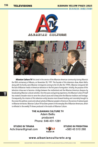 Albanian Culture TV first aired in the service of the Albanian-American community during Albania’s the 85th anniversary of Albania, on November 28, 1997. The founder of this television show, Adem Belliu along with his family, were Albanian immigrants coming to the US after the 1990’s. Albanian emigrants felt the lack of Albanian media in American television in the first years of emigration. Initially, the purpose of this television show was to become a bridge between the motherland and the Albanian American diaspora by broadcasting Albanian cultural activities. Over the years and gaining experience, the Albanian Culture TV staff has created a broader vision to serve the cultural cause and to keep alive the Albanian tradition and heritage. Consequently, the mission of this television entity became more forward-looking and concretely brought to the screen the political, social and cultural activity of Albanian people in America in the service of national goals in Albanian territories. Albanian Culture TV has been present in the everyday life of Albanian-Americans, which is reflected in the weekly TV shows produced in the studio of Albanian Culture.