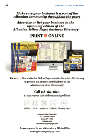 62 ALBANIAN YELLOW PAGES 2025 To reserve your ad for next edition call us at 718-584-1620 or contact@albanianyellowpages.com