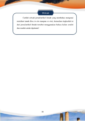 TUGAS Carilah sebuah jurnal/artikel ilmiah yang membahas mengenai remidiasi tanah (bisa in-situ maupun ex-situ), kemudian ringkaslah isi dari jurnal/artikel ilmiah tersebut menggunakan bahasa kalian sendiri dan mudah untuk dipahami! 30