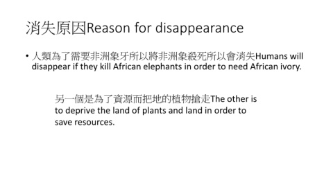 消失原因Reason for disappearance • 人類為了需要非洲象牙所以將非洲象殺死所以會消失Humans will disappear if they kill African elephants in order to need African ivory. 另一個是為了資源而把地的植物搶走The other is to deprive the land of plants and land in order to save resources.